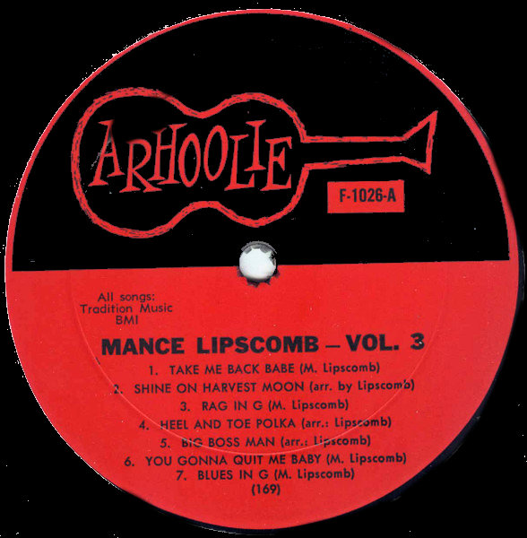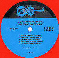 The Arhoolie labels were red with black print. The first album had no graphics (design #1, far left). Starting with F-1002 and continuing to 1964 (F-1016), there was a black field on the top half of the label with the Arhoolie guitar logo (design #2, center left). In 1964, the black field was reduced to about half the size and the guitar changed to red (design #3, near left). Promotional labels were white with black print with the same design. |